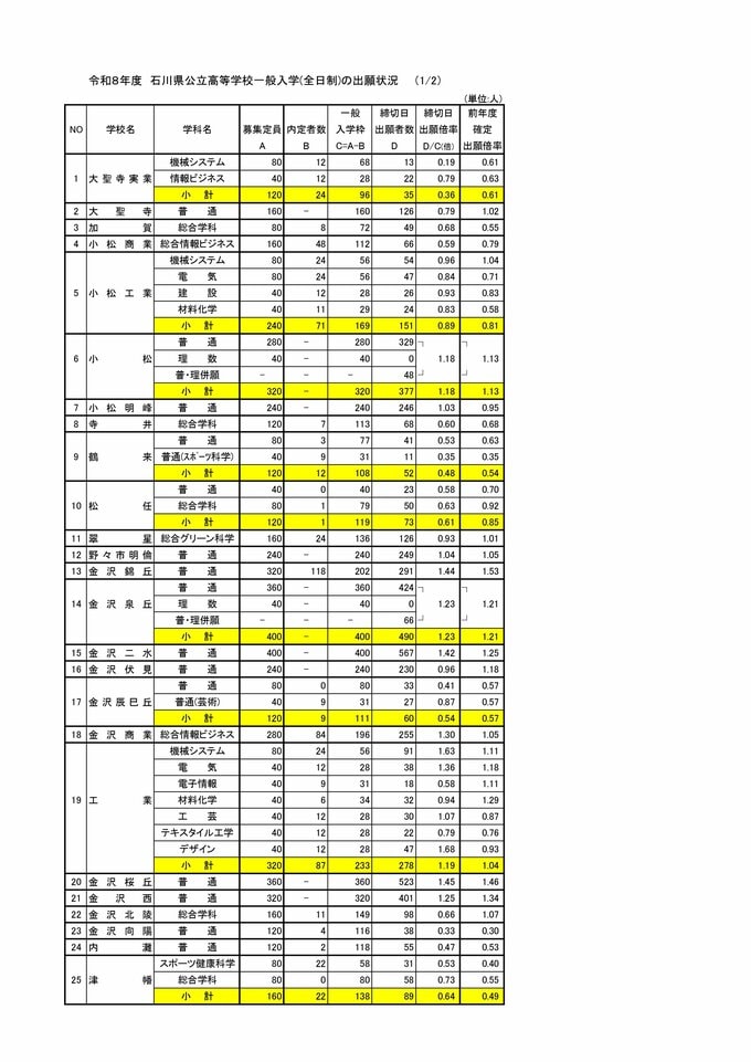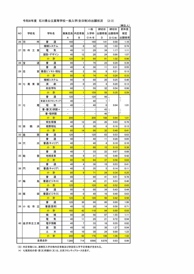 【全校の倍率2026】石川県公立高校一般入試2026 金沢桜丘が1.45倍 金沢錦丘が1.44倍…令和8年度の出願状況 北陸放送 2026年2月24日(火) 17:23 国内 石川県内40の全日制公立高校の入学願書の受け付けが24日、締め切られました。 全体の出願倍率は、0.93倍となっています。 県教育委員会が発表した各高校の倍率です。