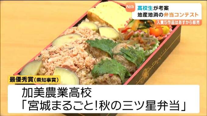 最優秀賞の「県知事賞」に選ばれたのは、加美農業高校の生徒が考案した「宮城まるごと!秋の三ツ星弁当」。