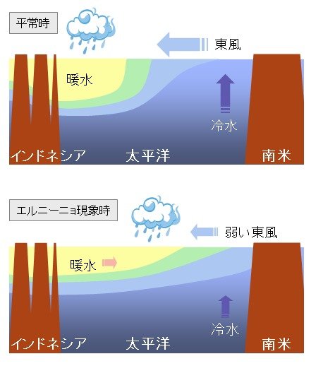 エルニーニョ現象とは、太平洋赤道域の日付変更線付近から南米沿岸にかけて海面水温が平年より高くなり、その状態が1年程度続く現象です。水蒸気を多く含んだ暖かい海域が南米側に寄ることで、その地域では積乱雲が発生しやすくなります。