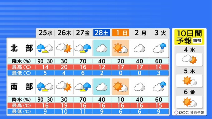 【あす2/25(水)広島天気 】昼前までまとまった雨 午後は次第に回復 気温高めも北風吹くとひんやり 中国放送 2026年2月24日(火) 19:05 国内 天気 高温傾向続く 天気は周期変化 この後も周期的に天気が変化するでしょう。木曜日は回復し、晴れ間が広がりますが、金曜日の日中から土曜日の未明~明け方にかけては再び雨が降る見込みです。気温は高めの傾向が続き、雨上がりは花粉の飛散量が増加するためご注意ください。