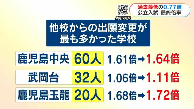 公立高校入試 最終出願倍率は? 鹿児島 南日本放送 2026年2月24日(火) 19:35 国内 他校からの出願変更が最も多かった学校は、 〇鹿児島中央で60人増加、1.61倍から1.64倍に倍率が上がり、 〇武岡台が32人増加、1.06倍から1.11倍に、 〇鹿児島玉龍が20人増加、1.68倍から1.72倍に上がりました。 ▶鹿児島県公立高校入試最終倍率(全校掲載)はこちらに掲載しています