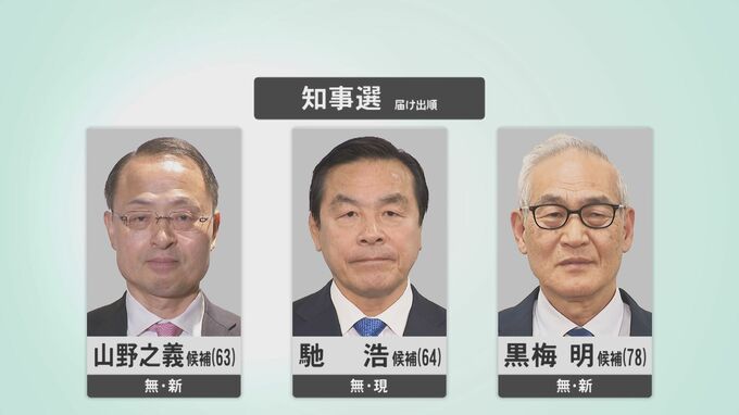 県知事選挙には届出順にいずれも無所属で、新人で前金沢市長の山野之義候補(63)、再選を目指す現職の馳浩候補(64)、新人で共産系の団体が擁立した黒梅明候補(78)の3人が立候補しています。