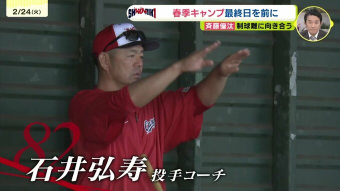 ブルペンでは石井コーチから「ゾーンを内、外の2分割でいい」とアドバイスを受け、課題改善に取り組みました。