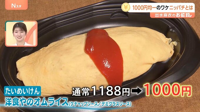 大丸東京店にずらっと並んだお弁当やお総菜。洋食の名店「たいめいけん」では、通常1188円の「洋食やのオムライス」も今だけ1000円で販売。また「イーション」では、脂がのったサーモンハラスに、イクラがのった「ノルウェー産サーモンハラスの親子重」も通常1190円が、今だけ1000円に。