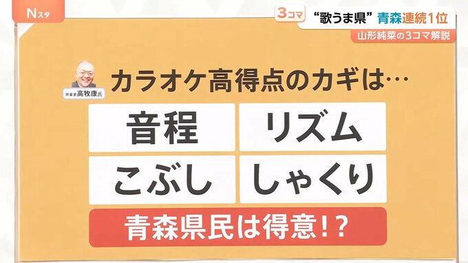 声楽家の高牧康さんによりますと、カラオケ高得点のカギは、▼音程、▼リズム、▼こぶし、▼しゃくりなど、が重要だそうです。青森県民の人はこれらが得意なのではないかとのこと。