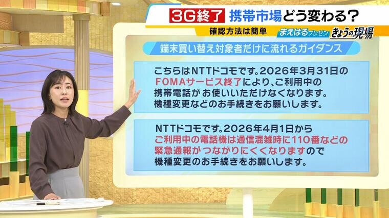 自分が使っている端末が今回のサービス終了の対象かどうかを確認する最も簡単な方法は、「誰かに電話をかけてみること」です。対象となる3G回線利用者には、呼び出し音が鳴る前に、以下のような音声ガイダンスが流れます。