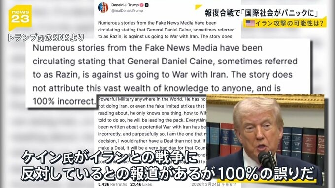 報道を受けて、トランプ大統領は自身のSNSに「ケイン氏がイランとの戦争に反対しているとの報道があるが、100%の誤りだ」と投稿。