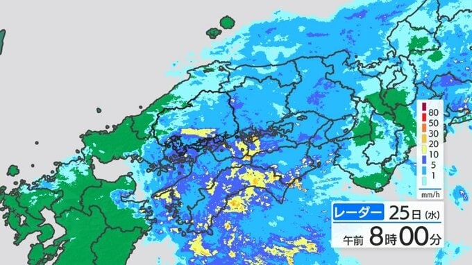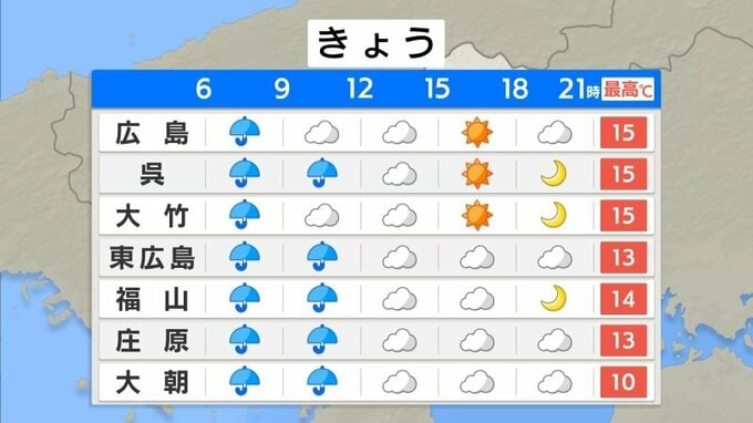 きょう25日(水)の広島県は、雨が降っています。朝の冷え込みは弱く、最低気温は広島9.6℃、福山10.9℃、三次7.7℃でした。