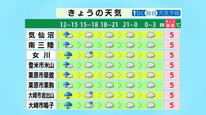 ■登米市米山:5℃ ■栗原市築館:5℃ ■栗原市栗駒:5℃