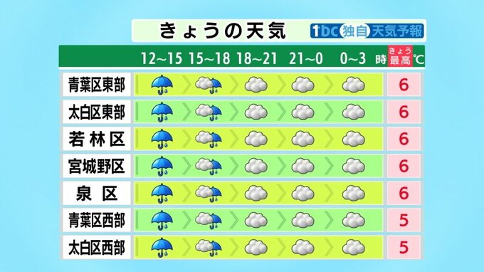 ■太白区東部:6℃ ■太白区西部:5℃ ■宮城野区:6℃