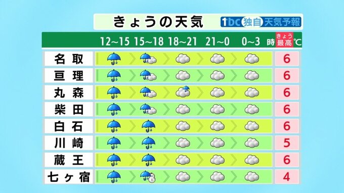 日差しはなく、比較的南のほうが雨の降る時間が長くなりそうです。七ヶ宿周辺では夕方あたり、雨に雪が混じってくる可能性があります。