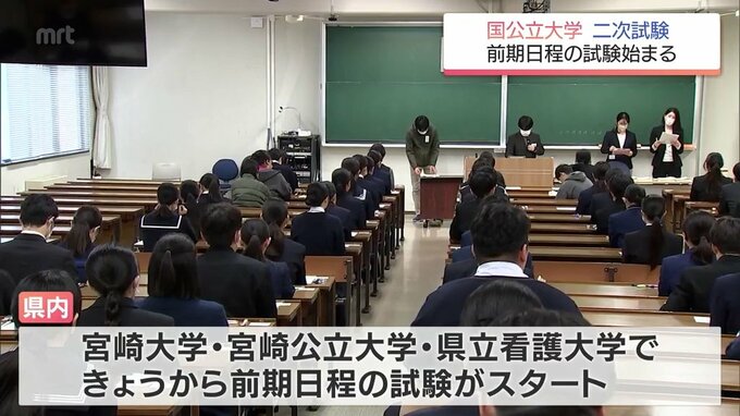 国公立大学の二次試験前期日程が始まり、宮崎県内でも多くの受験生が試験に臨んでいます。県内では、宮崎大学と宮崎公立大学、それに、県立看護大学で25日から前期日程の試験がスタートしました。このうち、宮崎大…