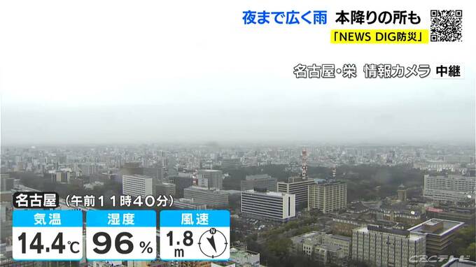 名古屋市内は、きのうの夜から雨が降り出し、正午前も雨雲が広がっています。午前11時までの24時間降水量は、各地で10ミリを超え、2週間ぶりに広い範囲でまとまった雨が降っています。