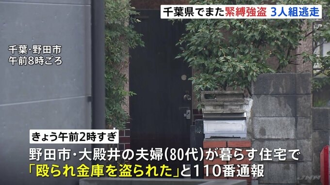 きょう未明、千葉県野田市の高齢夫婦の住宅に男ら3人が押し入り、夫婦を縛って夫を殴ったうえ金庫を奪って逃走しました。きょう午前2時すぎ、野田市大殿井の80代の夫婦が暮らす住宅で、「殴られ金庫を盗られた」と1…