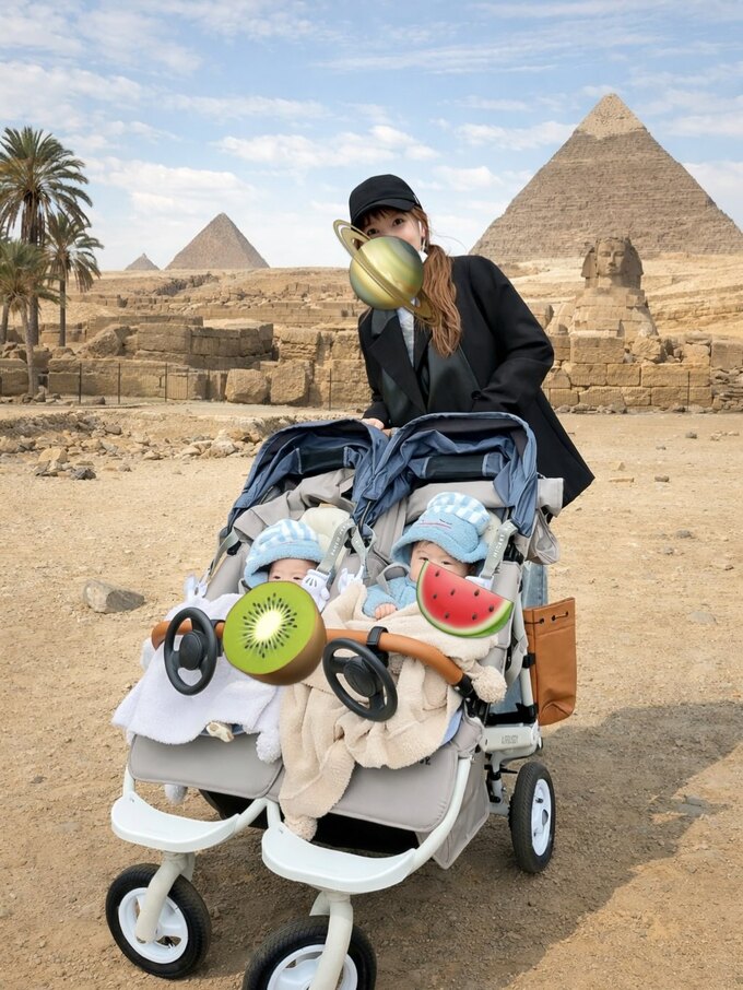 翔子さんは「背景をエジプトにして!と言ったら行けた、笑笑」と、ピラミッドやスフィンクスを背景にした写真も投稿。いずれも、ベビーカー散歩をした際の背景を、生成AIで描いた画像に差替えているものと思われます。