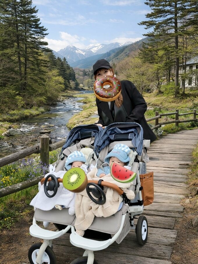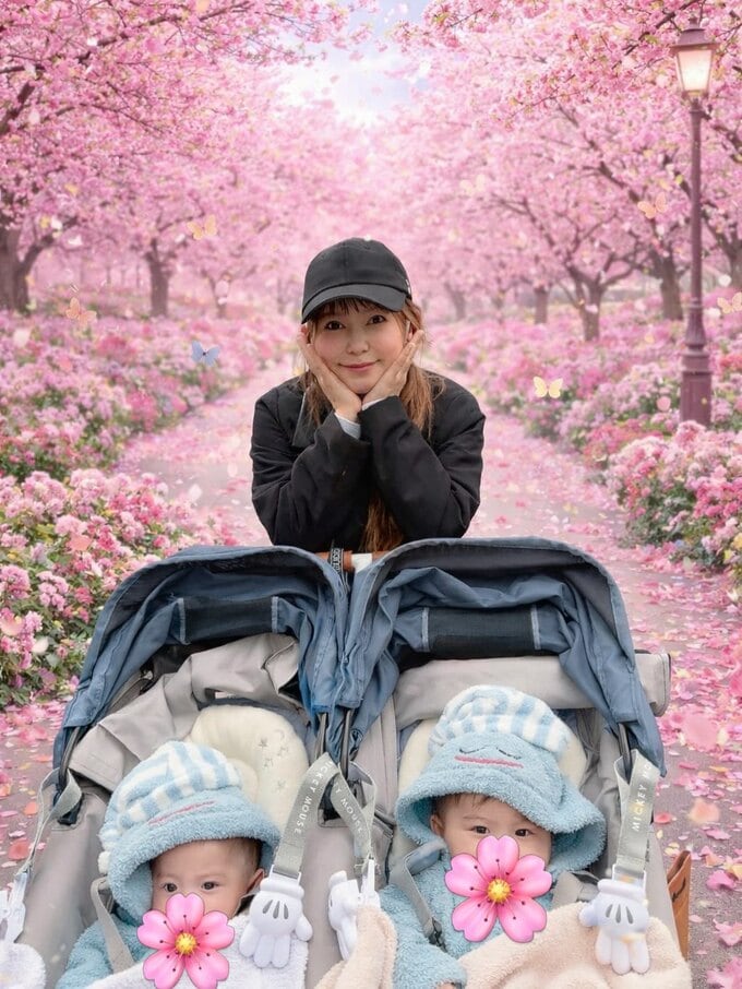 翔子さんは「あたたかくなってきてベビーカーのお散歩が楽しい」として、ベビーカーにのせた双子と共に様々な場所で撮影した写真を投稿。