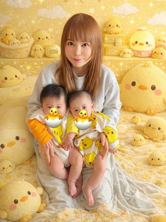 翔子さんは「チキンラーメンのひよこロンパース かわいすぎてゲット!」として、双子に〝ひよこロンパース〟を着させた写真の背景もAIで生成した模様。チキンラーメンのマスコットのひよこがたくさん集まって翔子さんと双子を囲むというほっこりな背景となっています。