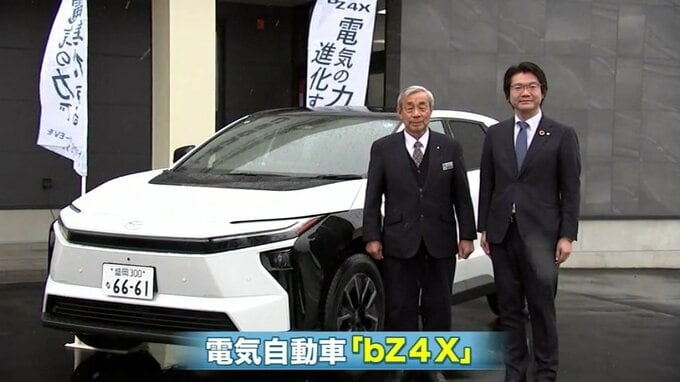 温室効果ガスの排出量、実質ゼロを目指して電気自動車「bZ4X(ビージーフォーエックス)」を贈ったのはトヨタカローラ岩手です。