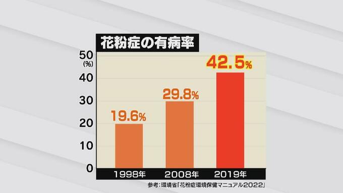 10年おきに実施されている鼻アレルギーの全国調査では、花粉症の有病率は1998年が19.6%、2008年が29.8%、2019年には42.5%と、20年間で2倍に増えていることが分かっています。
