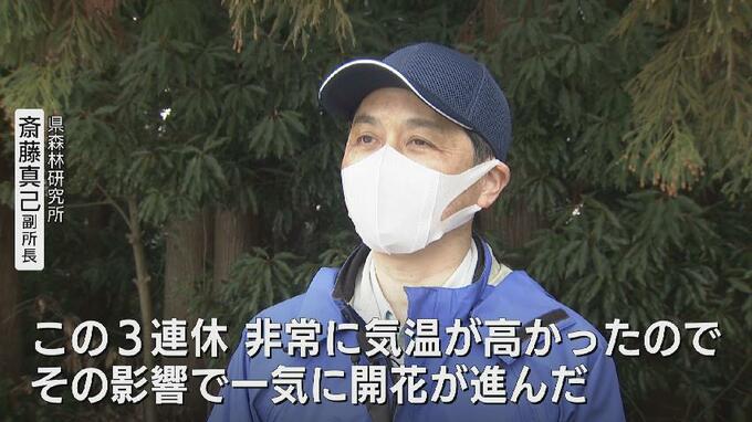「飛散は多分3月3日くらいかなって予想してたんですけども、とくに2月の中旬から気温が上がってきて、この3連休は非常に気温が高かったので、その影響で一気に開花が進んだ」