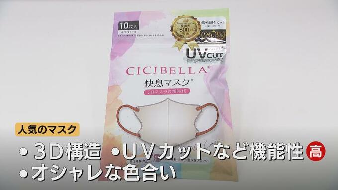 こちらのドラッグストアでも、今シーズンマスクの売れ行きが好調で、中でも、3D構造で息がしやすく、UVカットなどの機能性があり、オシャレな色合いのものが人気です。