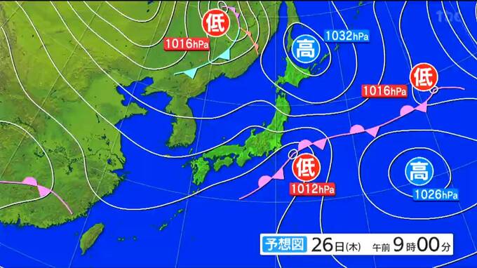26日午前9時の予想天気図です。太平洋側は北海道の北の高気圧から吹きだす湿った東風が流れ込むため雲が多く、日本海側は晴れ間が広がりそうです。
