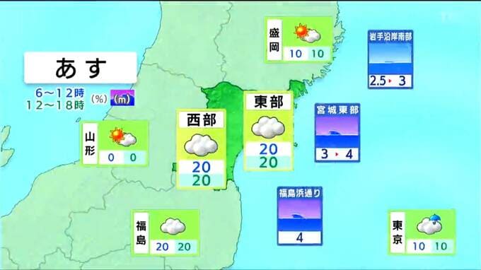 湿った空気の影響で低い雲に覆われ、南部を中心に弱い雨の降る所があるでしょう。海上では北東の風がやや強く、波が4メートルまで高くなる見込みで、高波に注意が必要です。
