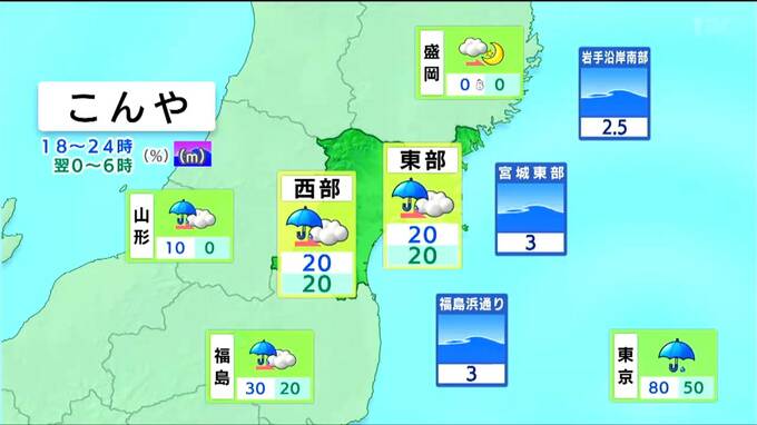前線や湿った空気の影響で午後6時頃まで南部を中心に雨が降りますが、夜は概ね曇りとなるでしょう。