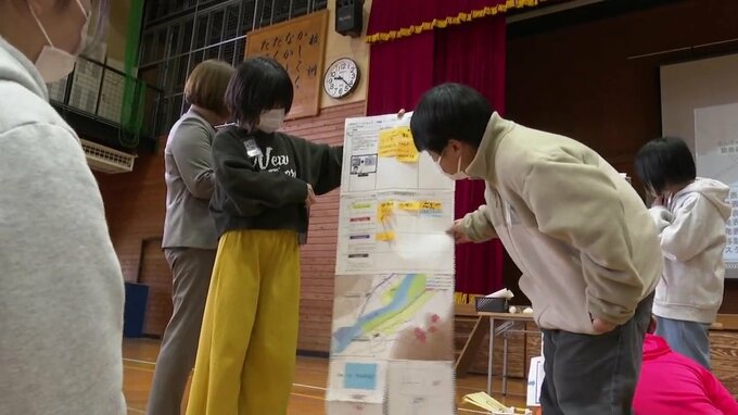 その後、子ども達はワークショップでハザードマップを使いながら、経験したことのない大雨が降った時「いつ、どこへ、どう避難するか」などについて話し合っていました。