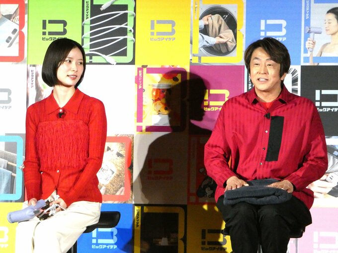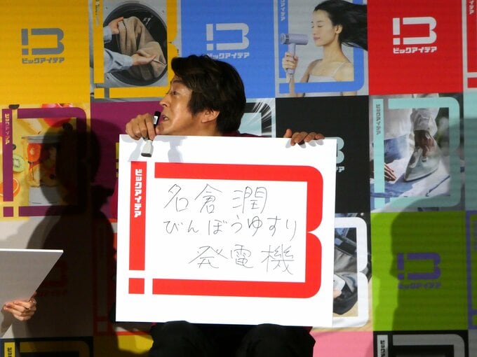 朝日さんは「角ハンガーをスムーズに折る」とフリップ回答。〝(付いている)洗濯ばさみが絡み合って、次に使おうとすると開かないのが毎回しようがないかなと思いながらちょっぴりストレス。(角ハンガーが)スムーズに開く電動式のものとか〟と主婦目線の悩みを話すと、話を聞いていたビックカメラの商品開発室の有末さんは「確かに。めっちゃ良いですね、作りたいです」と好反応。商品開発のプロをも唸らせるアイデアを展開した朝日さんは、〝採用する場合はちゃんと(製品パッケージに)「朝日奈央」って書いてください〟と、図々しくおねだりし会場の笑いを誘っていました。