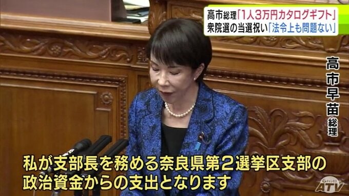 高市総理が衆院選の当選祝いを自民党議員へ配っていたことについて、高市総理は青森県選出の田名部匡代議員の質問に対して、1人に3万円のカタログギフトを配ったとしたうえで、「法令上、問題ない」との認識を示しました。