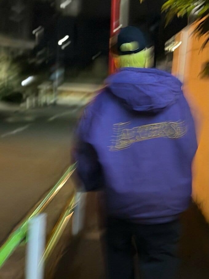 岸さんは、白いTシャツにNBAのロサンゼルス・レイカーズのロゴが入った紫色のフードジャケットを羽織り、黒いキャップというコーディネート。