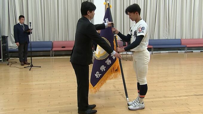 3年ぶりに英明に届いたセンバツ旗です。西本校長が野球部の池田キャプテンに渡して選手を激励しました。