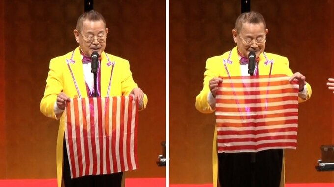 「裏も表も縦縞のハンカチを手の中に丸めて、軽く揉むと横縞になるっていう」ネタです。