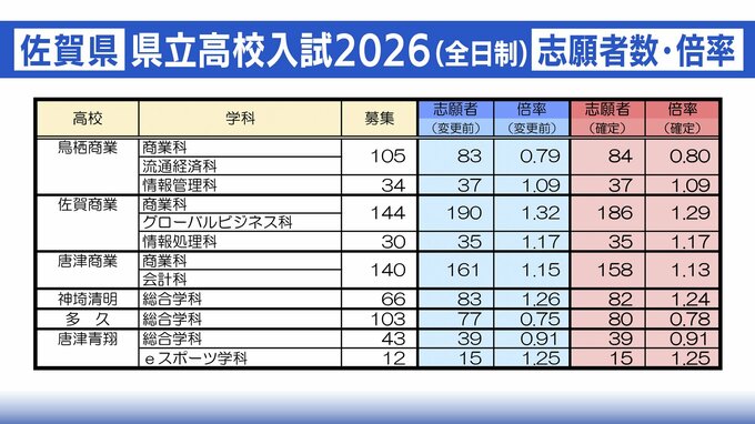 【全校掲載・確定版】佐賀県立高校 2026年一般入試の志願者数・倍率 佐賀西1.20倍・致遠館(理数)1.13倍(普通)1.42倍・唐津東1.16倍・佐賀北(普通)1.59倍(芸術)1.26倍 RKB毎日放送 2026年2月25日(水) 18:11 国内 鳥栖商業・佐賀商業・唐津商業・神埼清明・多久・唐津青翔