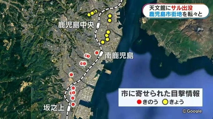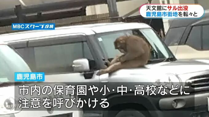 天文館にもサル出没!堂々と横断歩道渡る姿も…同じサル1匹か 城西中学校でも 鹿児島 南日本放送 2026年2月25日(水) 18:57 国内 市に寄せられた目撃情報は サルは、24日は谷山中央や宇宿など鹿児島市南部で、25日は荒田や天文館、城西中学校などで確認されています。 市は、市内の保育園や、小・中・高校などに対し、注意を呼びかけています。