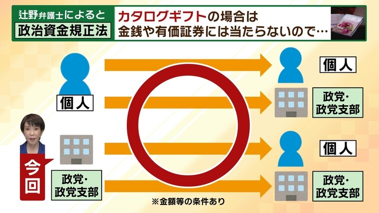 ただし、政治資金規正法で規制されているのは「金銭や有価証券」です。「カタログギフト」は問題ないのでしょうか?辻野弁護士は「カタログギフトは金銭・有価証券にあたらない」と指摘します。