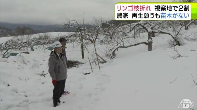 青森県大鰐町の山田年伸町長が25日、大雪で幹割れなどの被害が出ているリンゴ園を視察しました。リンゴ農家からは約2割に被害があり、再生するにも苗木がない窮状を伝えられました。