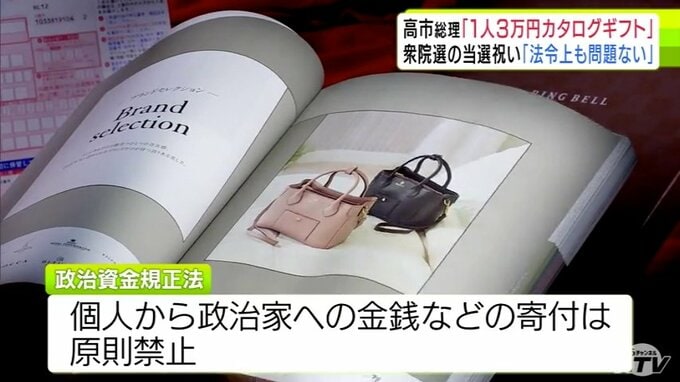 これはJNNが入手した高市総理側から衆院選で当選した自民党議員に配布されたカタログギフトですが、渡された際、のし袋に入れられていて、「御祝 高市早苗」と記載されていました。