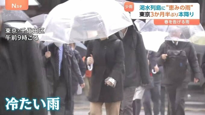 久しぶりのまとまった雨。記録的な少雨に苦しんだ人にとって、“恵みの雨”となったのでしょうか。暖かさから一転、冷たい雨。東京都心で30ミリ以上の雨が降るのは去年の10月31日以来、117日ぶりのことです。「傘1…