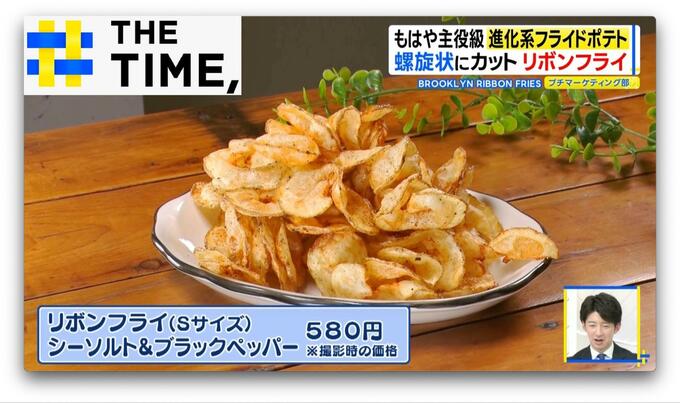 店名にもなっている「リボンフライ シーソルト&ブラックペッパー」(Sサイズ・580円※撮影時の価格)は、北海道産のじゃがいもをかき氷のように回転させ“螺旋状にカット”。