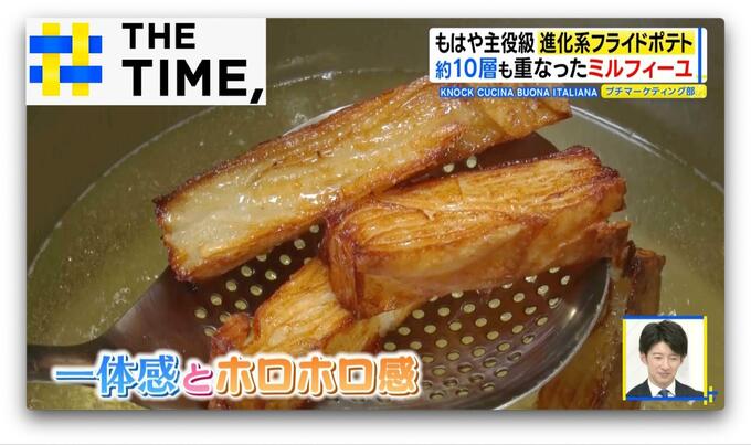 薄くスライスしたじゃがいもを“約10層に重ね”、じっくりオーブンで焼いてから揚げています。