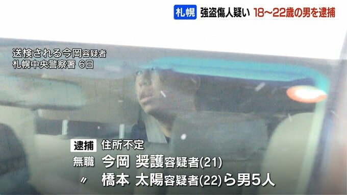 住所不定・無職の今岡奨護(いまおかしょうご)容疑者と橋本太陽(はしもとたいよう)容疑者ら男5人は、去年8月、札幌市内の知人の20代の男性の自宅などで男性の上半身をナイフで切りつけたり、警棒で殴ったりして暴行。