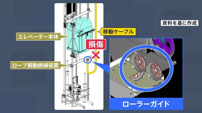 運営会社によると、エレベーター本体とつながっているケーブルが本体の下にある振動を抑える装置のローラーガイド=滑車のようなものに巻き込まれたことで、内部配線が損傷したということです。