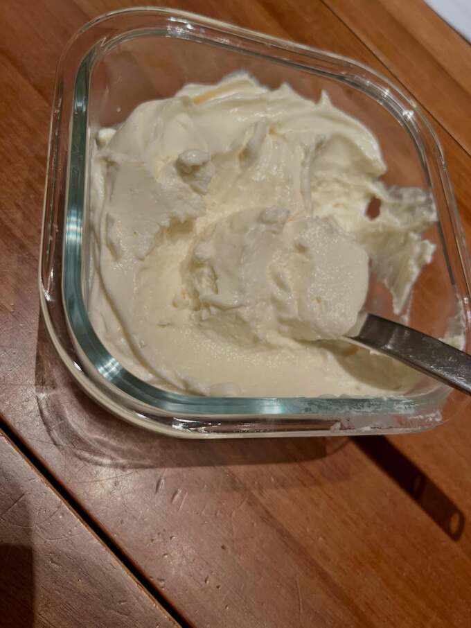 特に注目されるのは、ケーキの上に乗せるクリームのヘルシーバージョンです。普段のキャロットケーキのクリームはクリームチーズとレモンと砂糖を使用しますが、今回はカッテージチーズ(スムース)に生クリーム100ml程度とレモン汁、てんさい糖を入れて作ったとのことです。