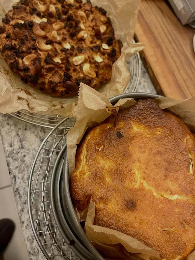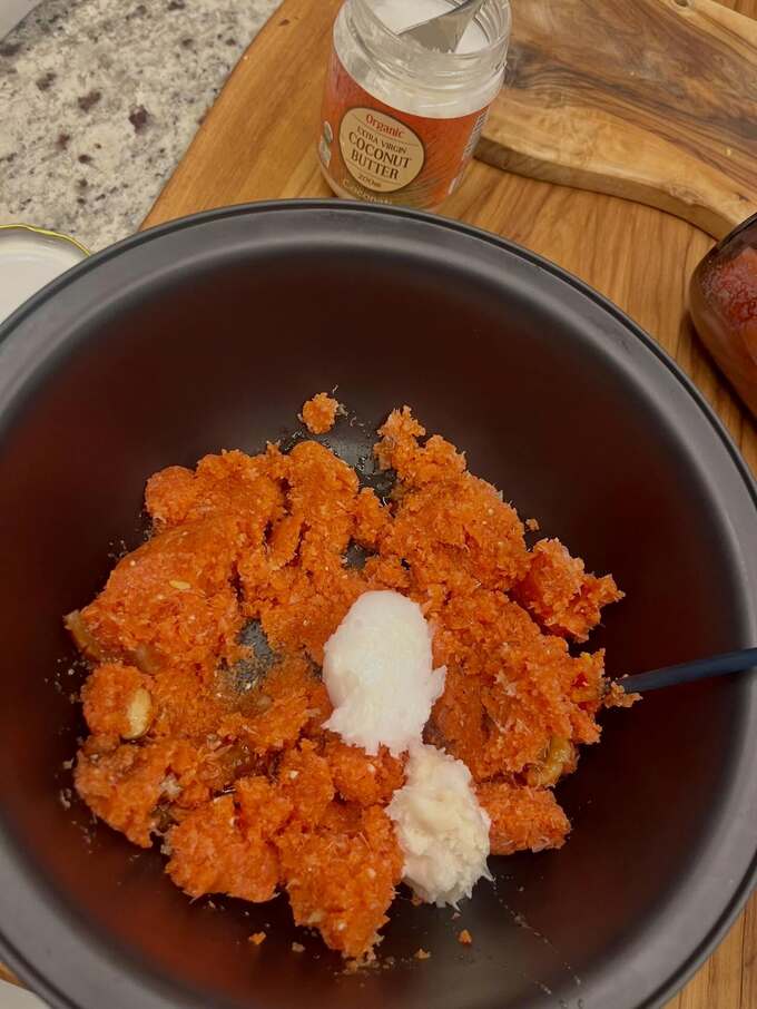 レシピによると、絞り殻にシナモン、卵2個、ココナッツオイル大さじ山盛り2杯程度、全粒粉大さじ山盛り3杯程度、ベーキングパウダー小さじ半分、ナッツ、レーズン、はちみつを加えて約50分焼いたということです。ただし、「お肉をお料理している間に少し焦がしました〜」と失敗談も明かしました。