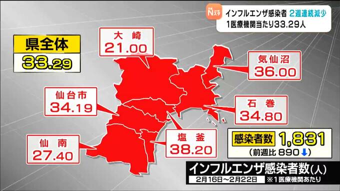 2月22日までに宮城県内でインフルエンザに感染した人の数は1医療機関あたり33.29人で2週連続で減少しました。依然としてすべての保健所で警戒が必要な水準を上回っていて県が注意を呼びかけています。宮城県により…