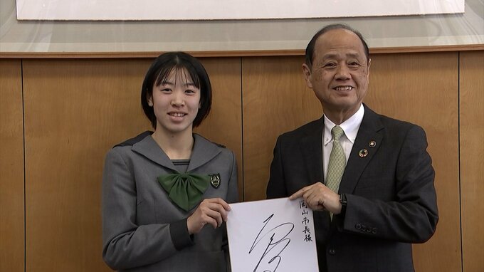 岡山市役所を訪れたのは、玉野市出身で、山陽学園高校3年の面手凜選手です。面手選手は、今月17日まで行われた世界卓球・団体戦の日本代表選考会で優勝しました。