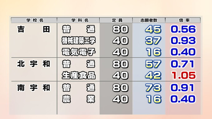 愛媛県立高校入試2026年 一般入試・変更後の志願倍率 松山東0.97倍 松山南1.08倍 松山北1.18倍 今治西0.95倍 全体は0.89倍【全高校・全学科掲載】