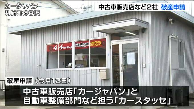 東京商工リサーチによりますと、2月12日に仙台地裁に破産を申請したのは、利府町神谷沢の中古車販売店「カージャパン」と、その自動車整備部門などを担っていた仙台市若林区六丁の目西町の「カースタッセ」です。